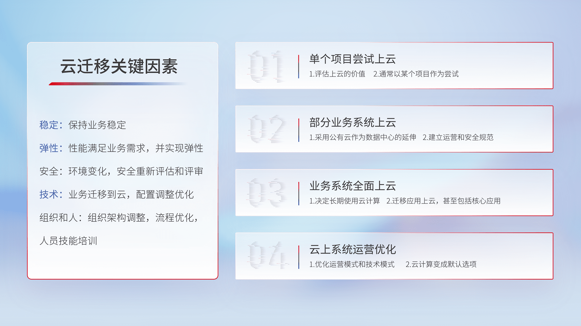 结合实际业务,,,从规划设计、、、云平台选型、、云原生改造、、、数据迁移、、、集成交付,,,,迁移全过程为客户识别最佳上云路径,,,,做好风险识别管理,,设计网络架构、、、身份权限、、、、安全审计合规、、、、操作审计、、、、日志审计、、监控告警策略、、多站点容灾设计等,,对云上基础设施进行整体规划,,提升IT治理水平,,以满足弹性、、、高可用、、、高性能的需求。。。