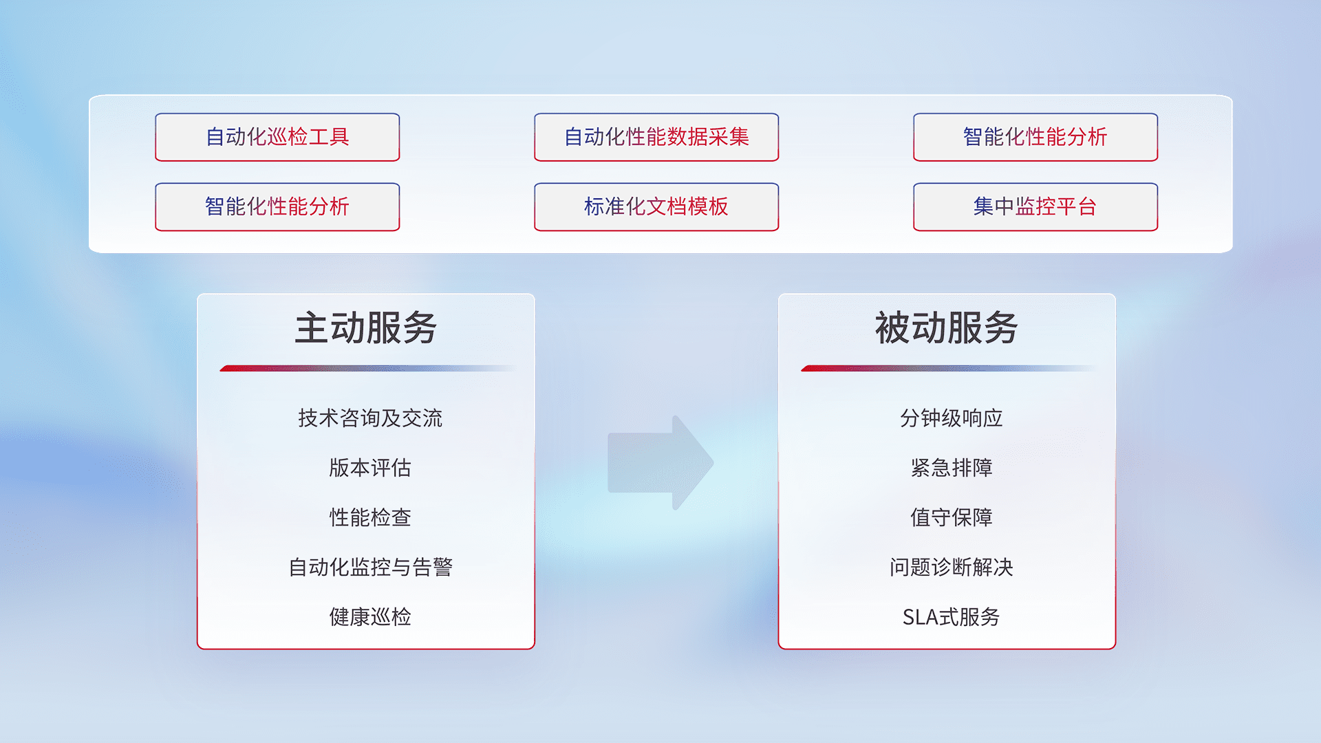 智能化工具和标准化文档,,,,保障服务质量,,,,提供主动服务(包含技术咨询、、、、版本评估、、、、性能检查、、、、自动化监控与告警、、、、健康巡检)和被动服务包含(分钟级响应、、紧急排障、、、值守保障、、问题诊断解决、、SLA服务)。。。。